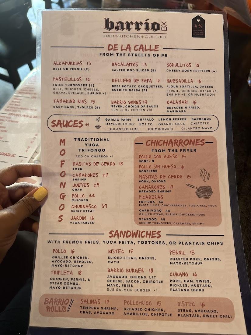 Experience Puerto Rican culture through every bite and beat at Barrio BX. Enjoy our casual yet trendy space designed for families, locals, and the LGBTQ+ community alike. Our welcoming environment is fully wheelchair accessible, including toilet facilities, and we happily accommodate pets outside. Relish outdoor seating or opt for dine-in, takeaway, or no-contact delivery to suit your preferences. Perfect for solo diners or groups, our menu features comfort foods, quick bites, and happy-hour specials like mojitos and flan. We accept credit cards, debit cards, and modern mobile payments for seamless transactions. Garden parking on the street is free, but paid spots are also nearby for your convenience.
